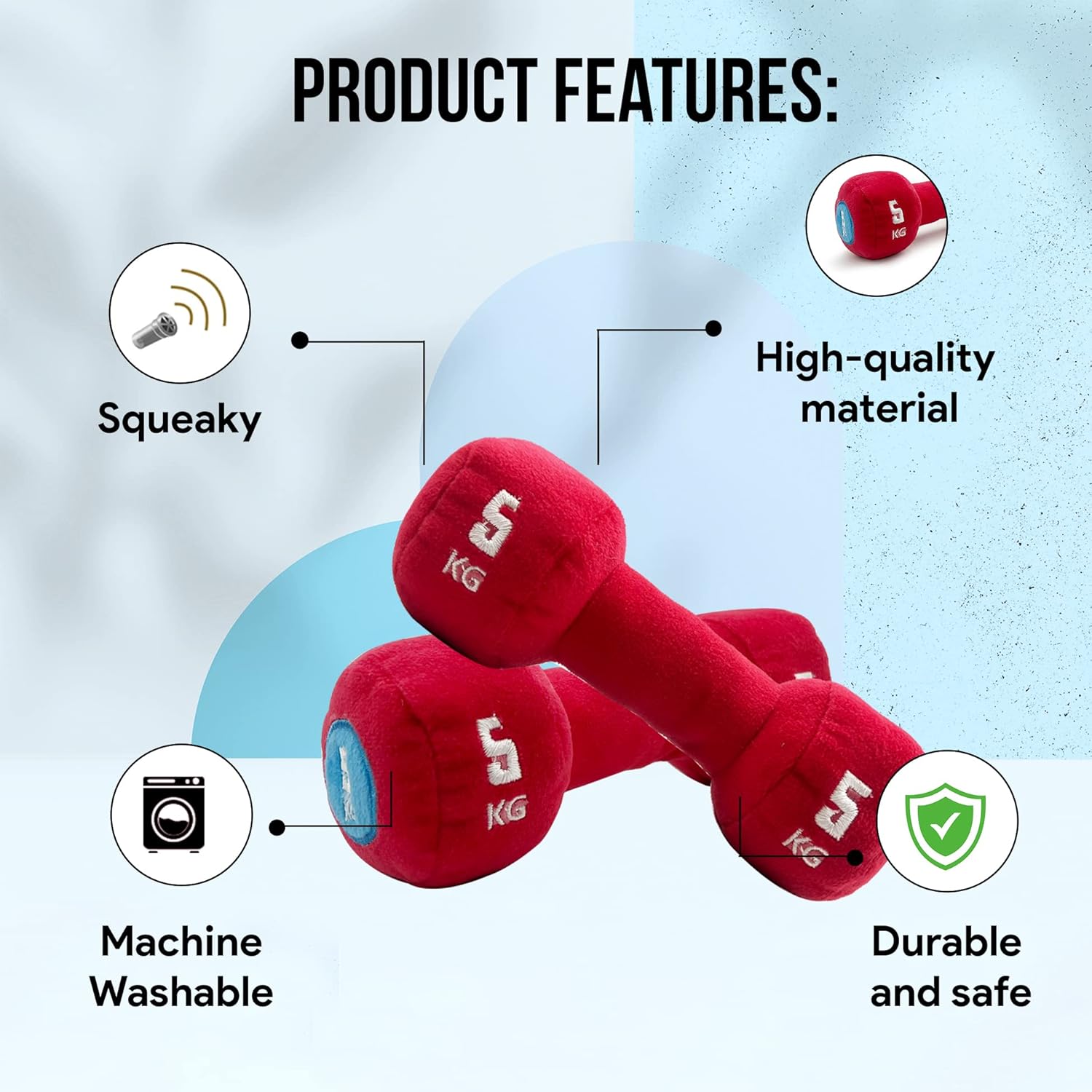 Dog Dumbbell: Goofy Tails brings you a new plush squeaky dog toy, “Dog Dumbbell Squeaky”. Our beautifully designed plush dumbbell comes with a squeaker inside. It is a super cute plush dumbbell squeaker for your dog to workout right along with you!